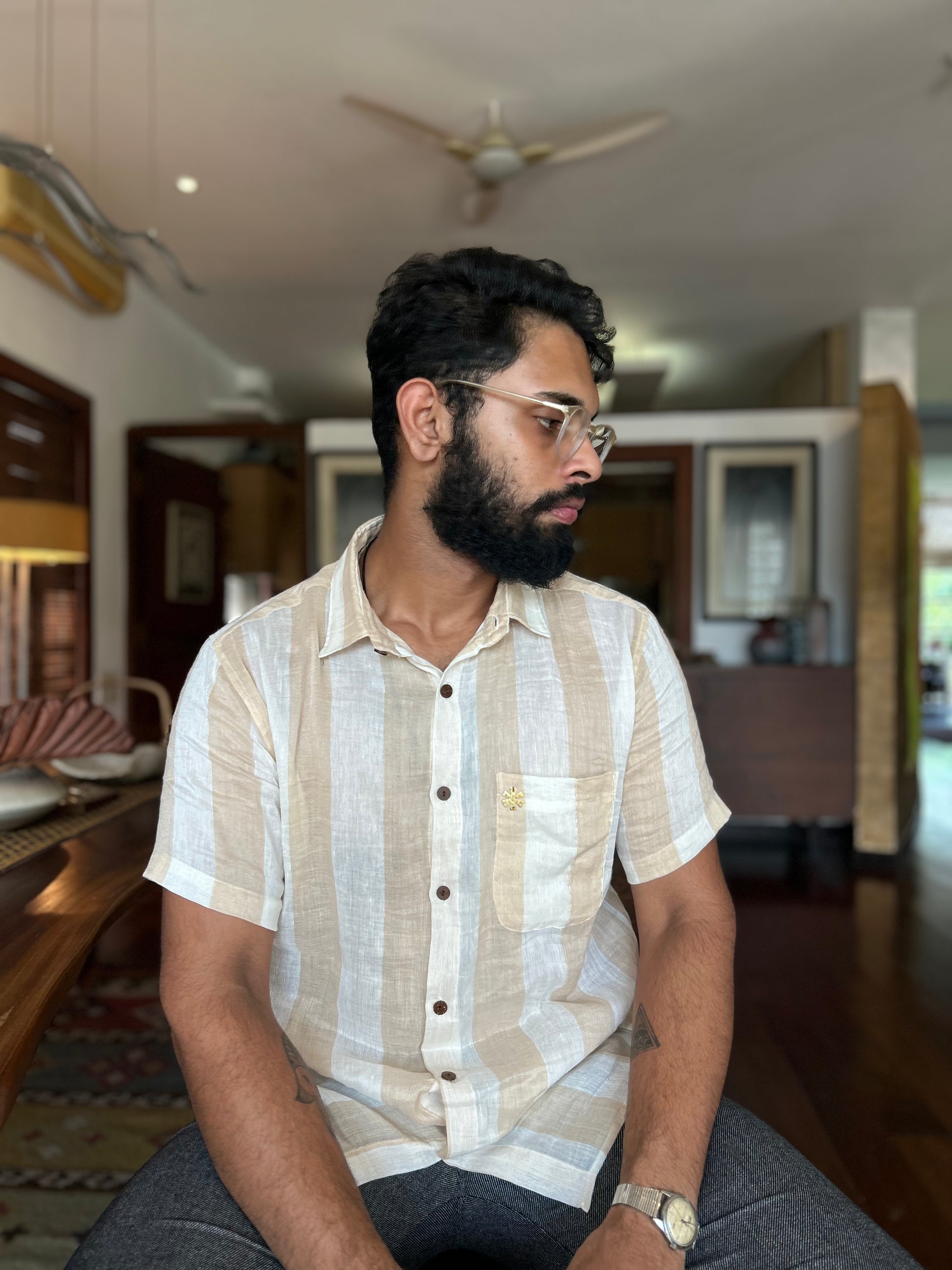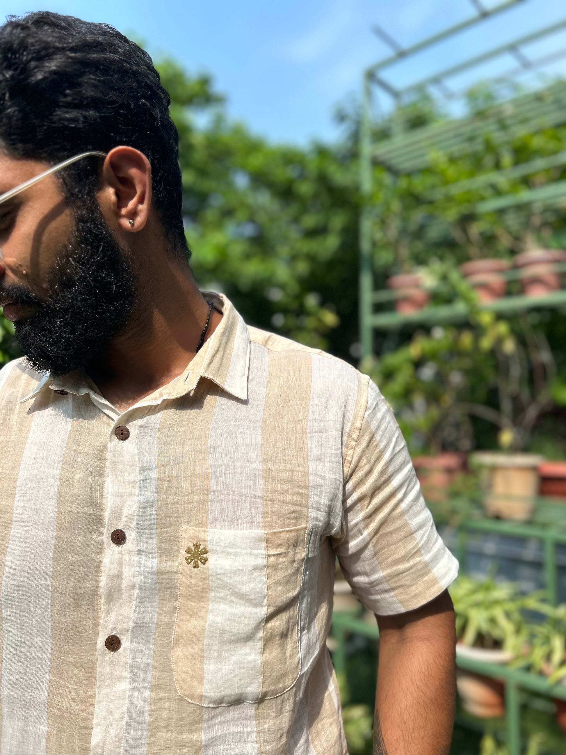 beige linen shirt half - sleeve