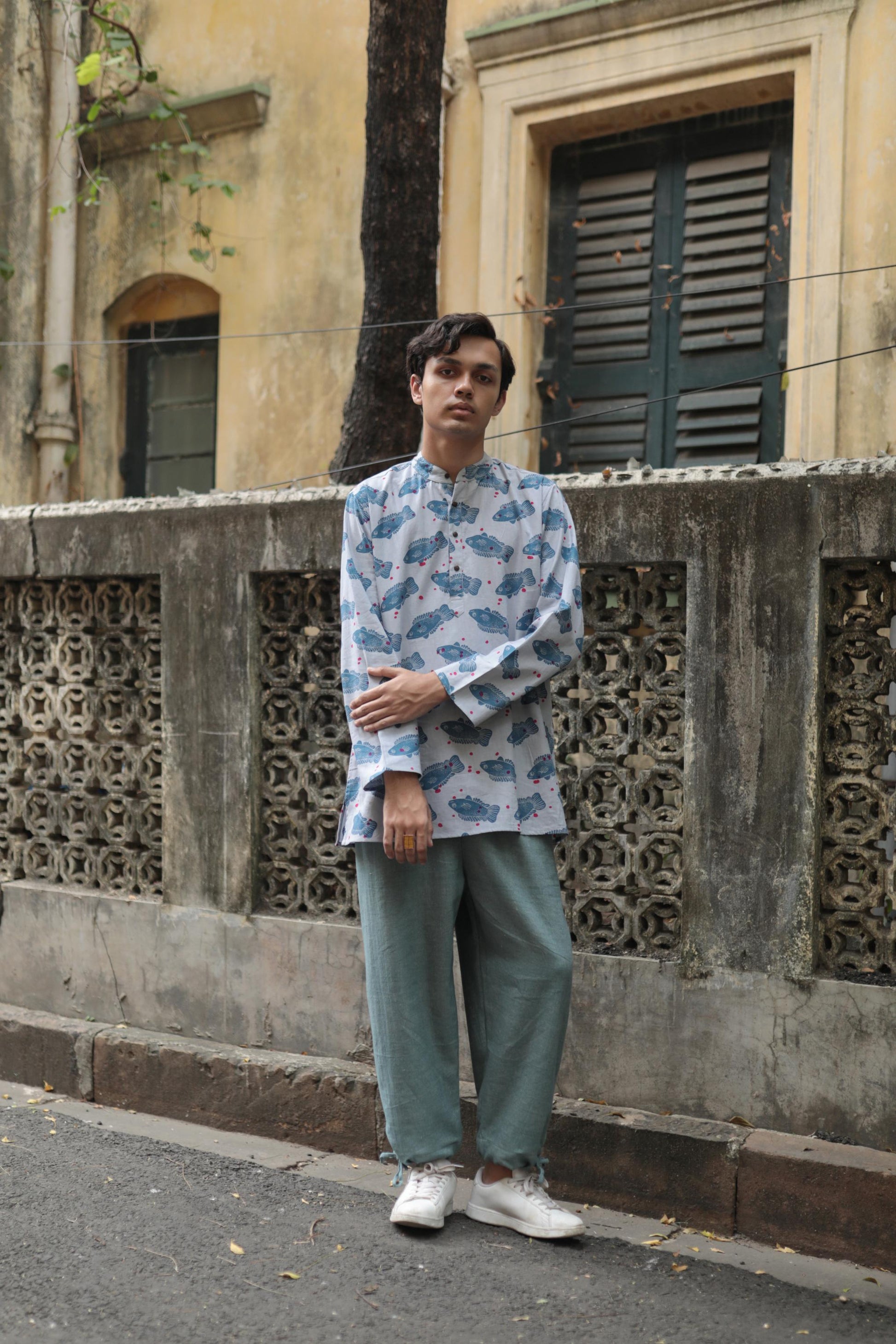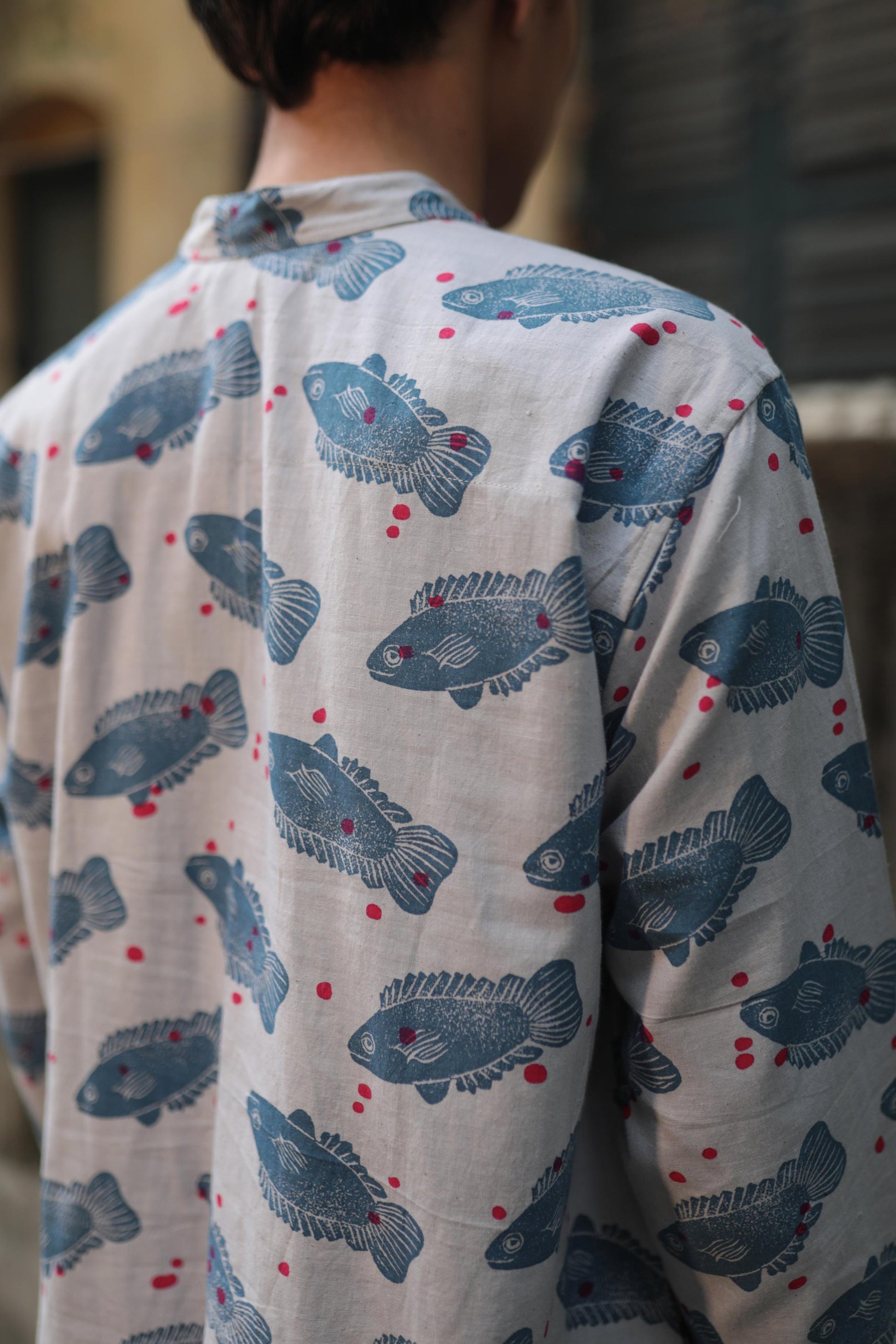 a school of koi mach printed on handwoven khadi cotton, this shirt will make you feel like swimming through the day. It has a laid-back fit with full sleeves and a pocket on the left side.