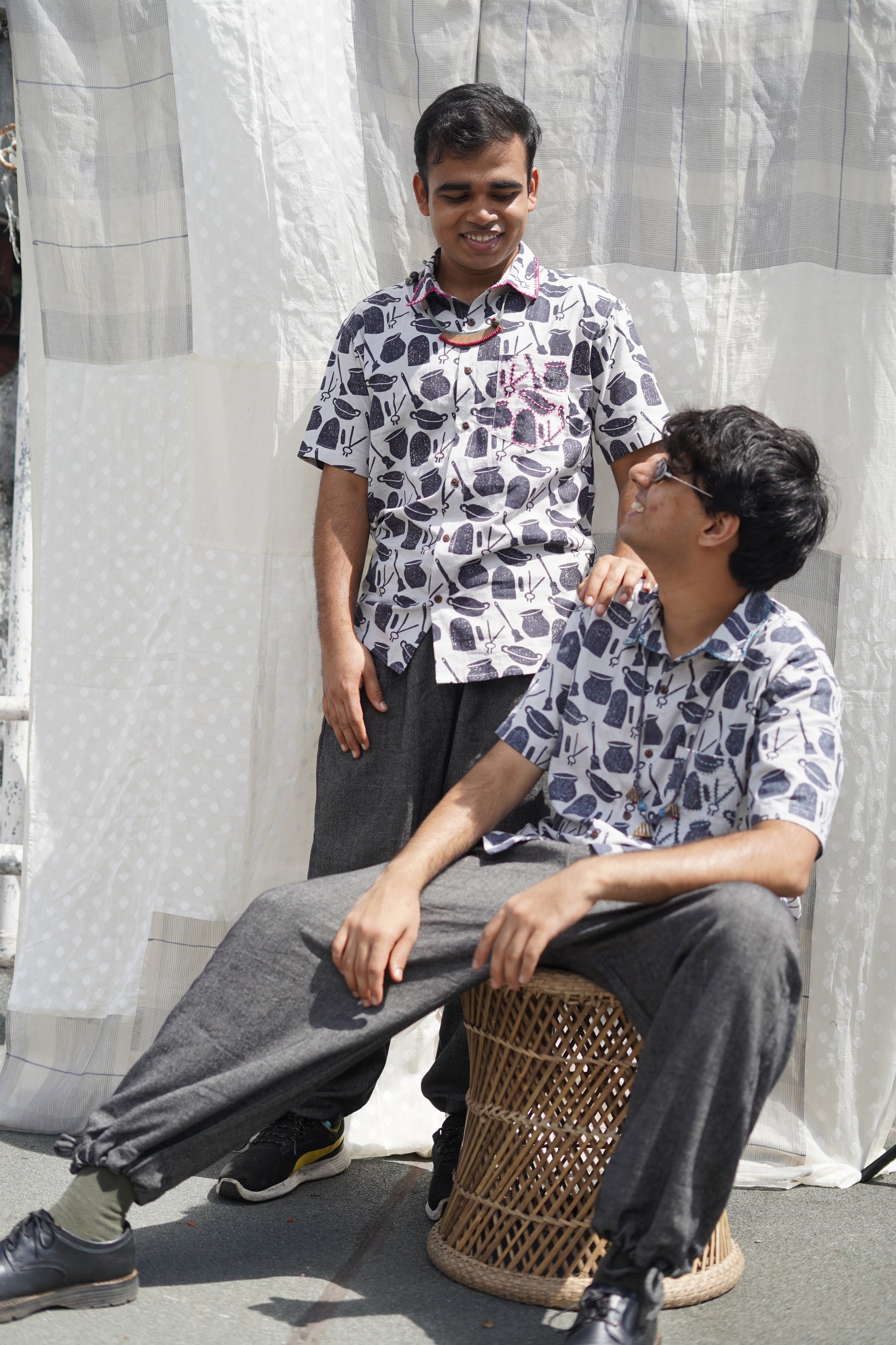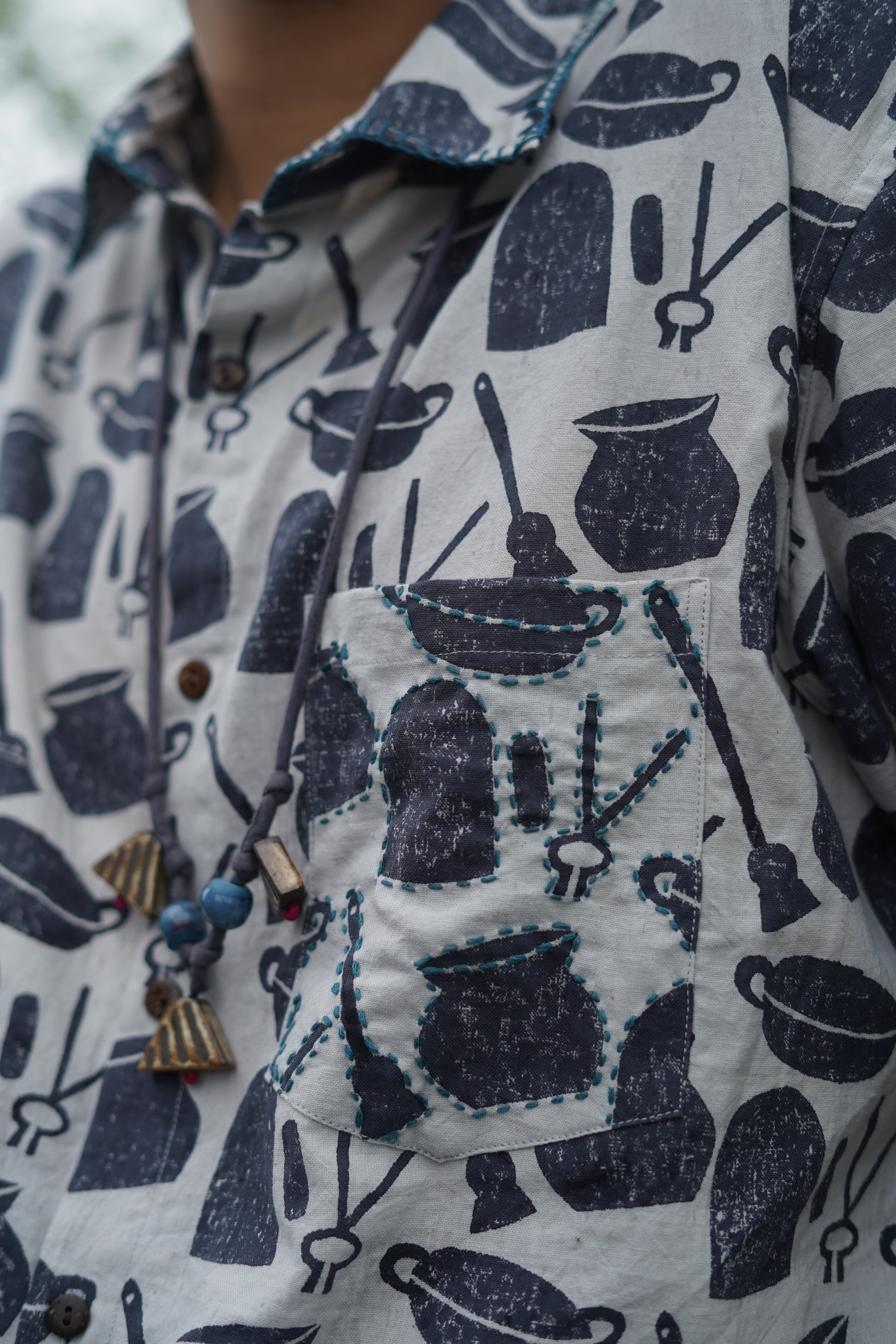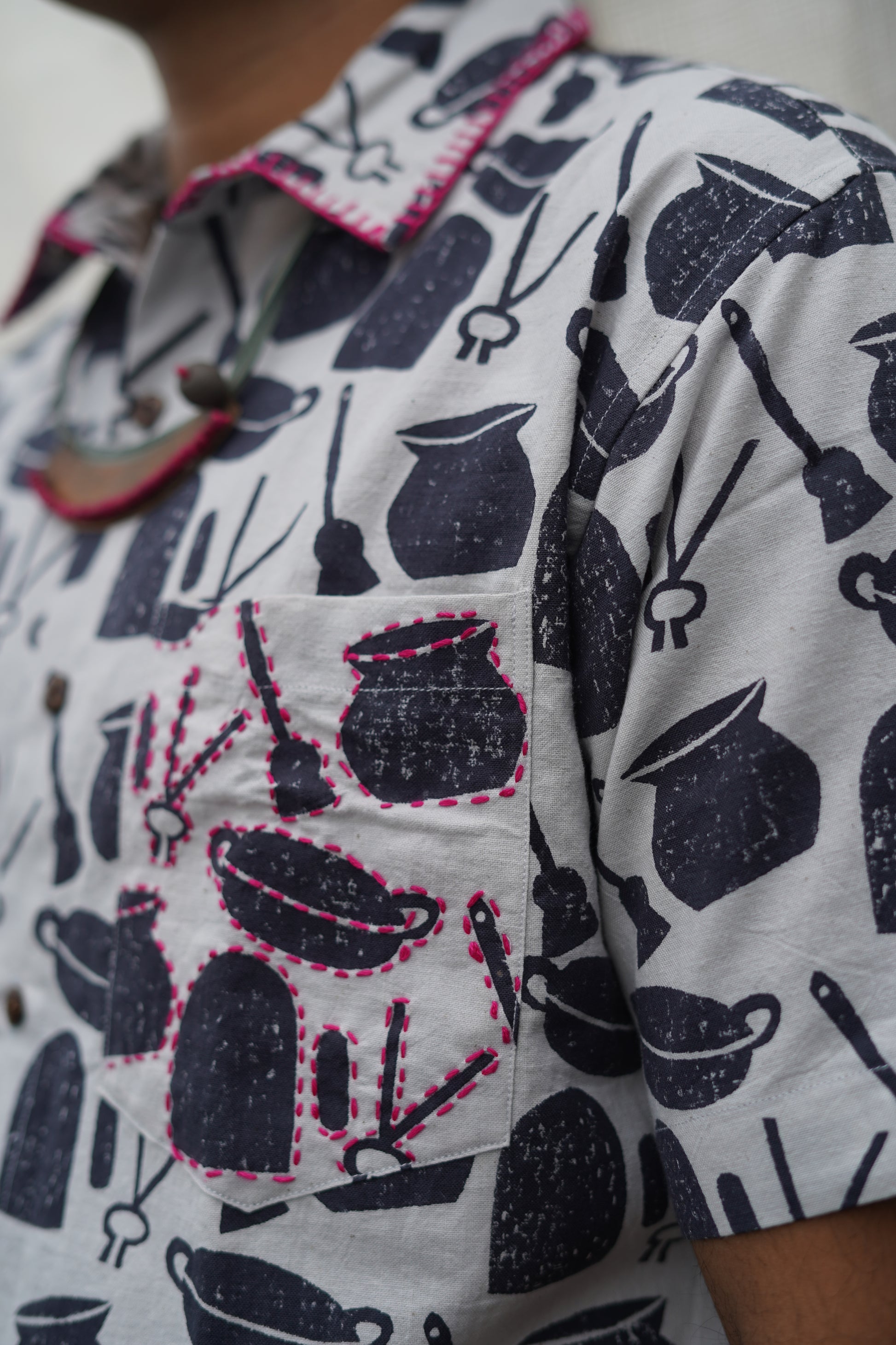 this shirt is our dedication to the home kitchens of Bengal, where everyday cooking utensils are transformed into tools of craft and artistry. It's also a nod to Bengali rituals of childhood play, where these very same tools become integral to the fashioning of new worlds and imaginative storytelling. Wear our ranna-bati shirt to reconnect with your playful side, and seek respite from the humid heat.