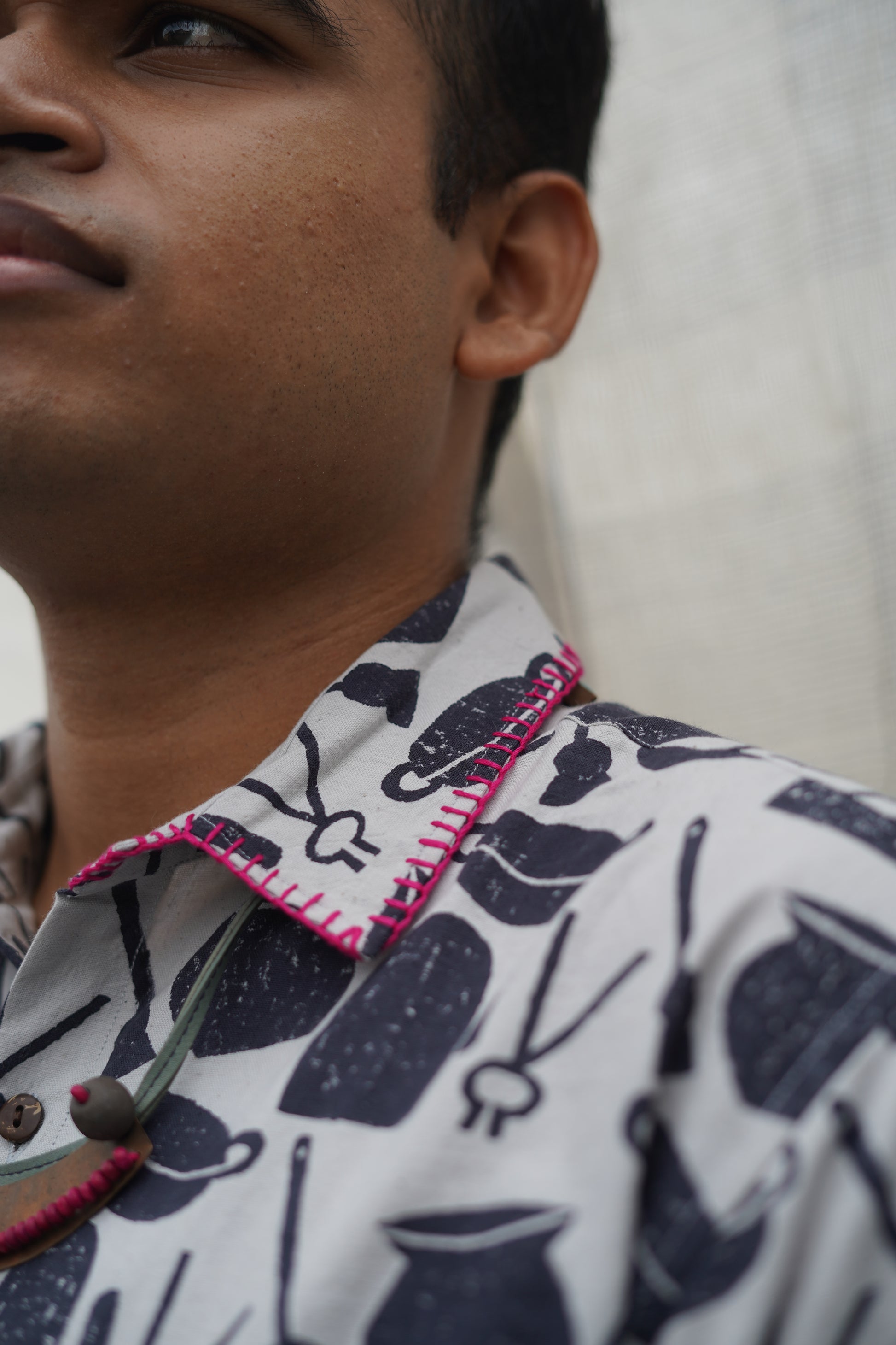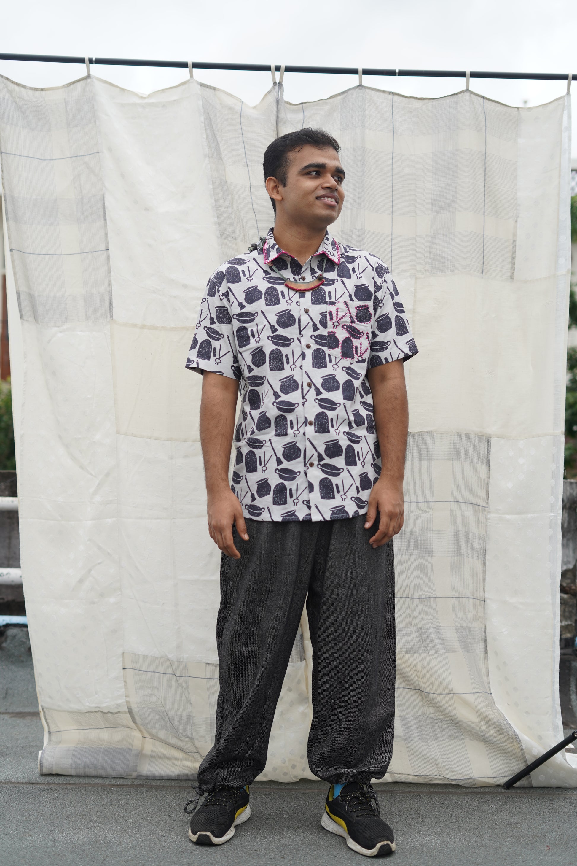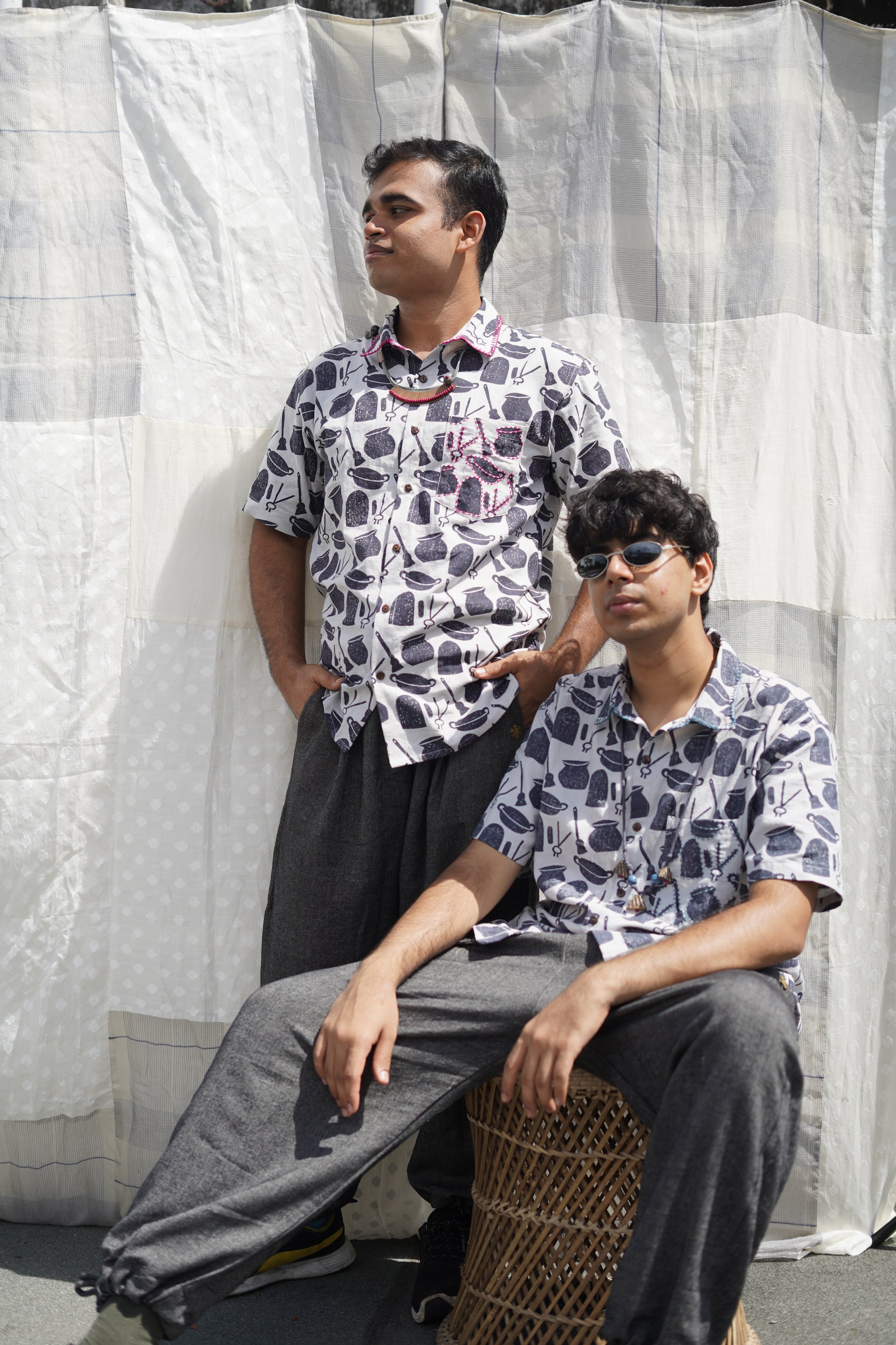 this shirt is our dedication to the home kitchens of Bengal, where everyday cooking utensils are transformed into tools of craft and artistry. It's also a nod to Bengali rituals of childhood play, where these very same tools become integral to the fashioning of new worlds and imaginative storytelling. Wear our ranna-bati shirt to reconnect with your playful side, and seek respite from the humid heat.