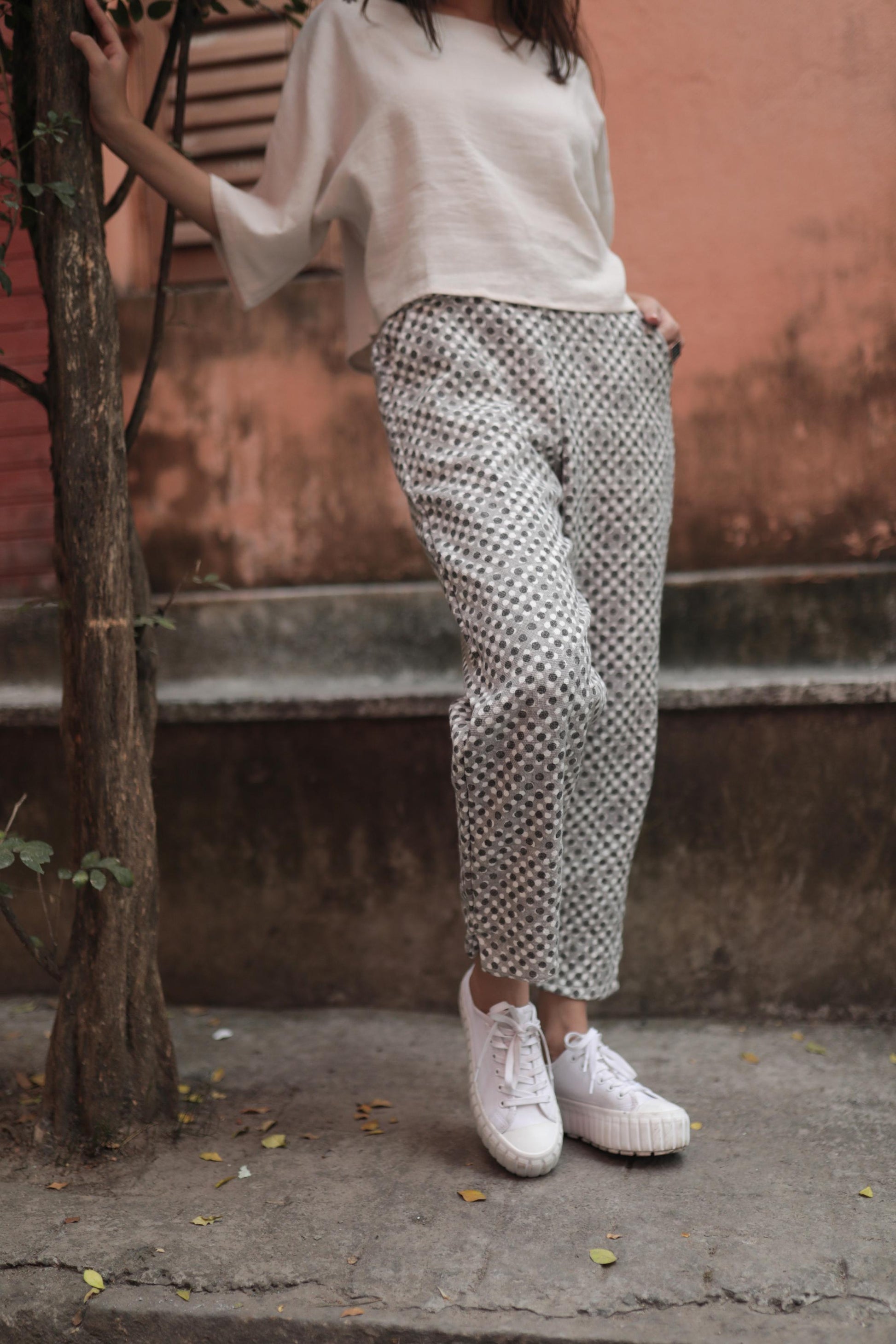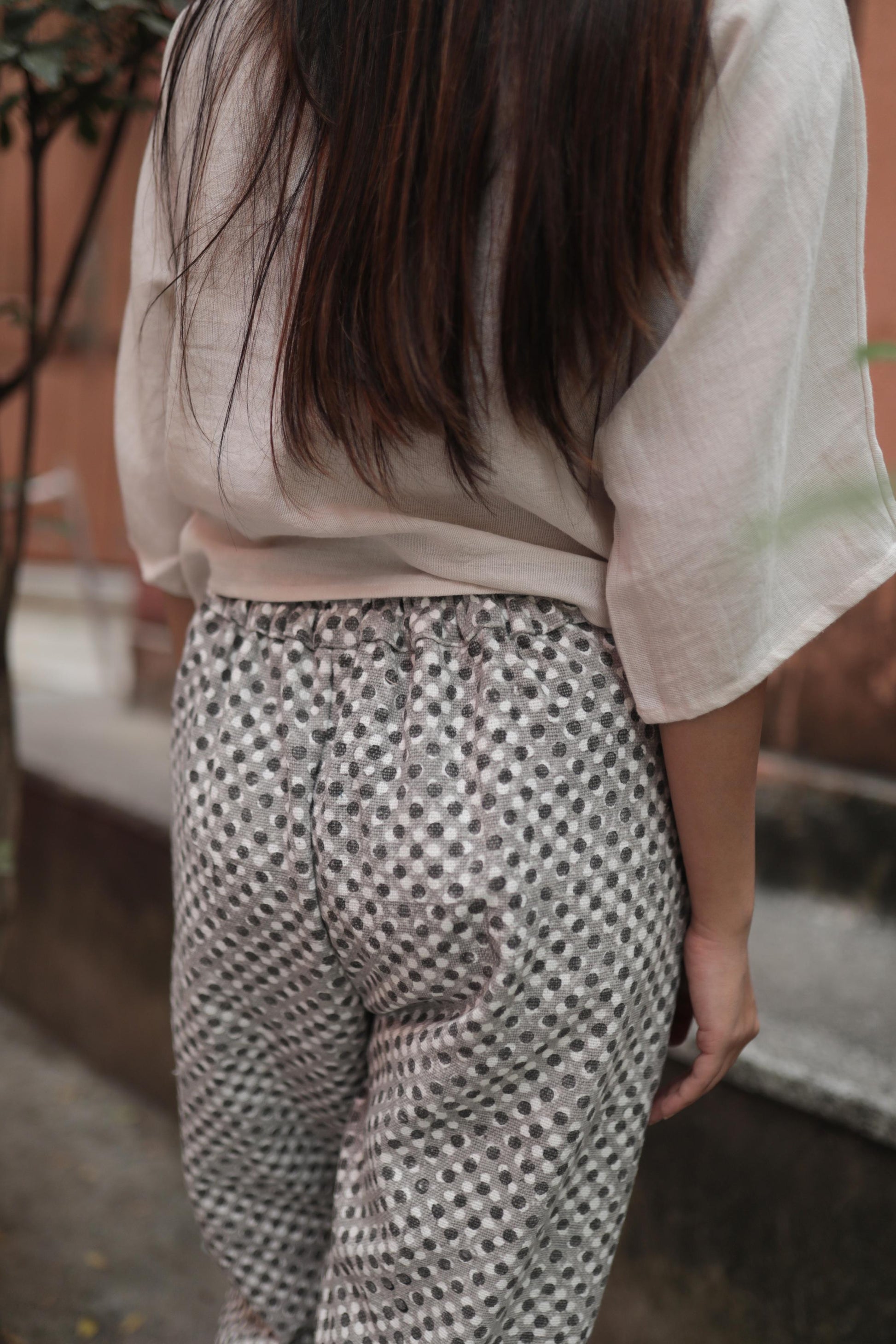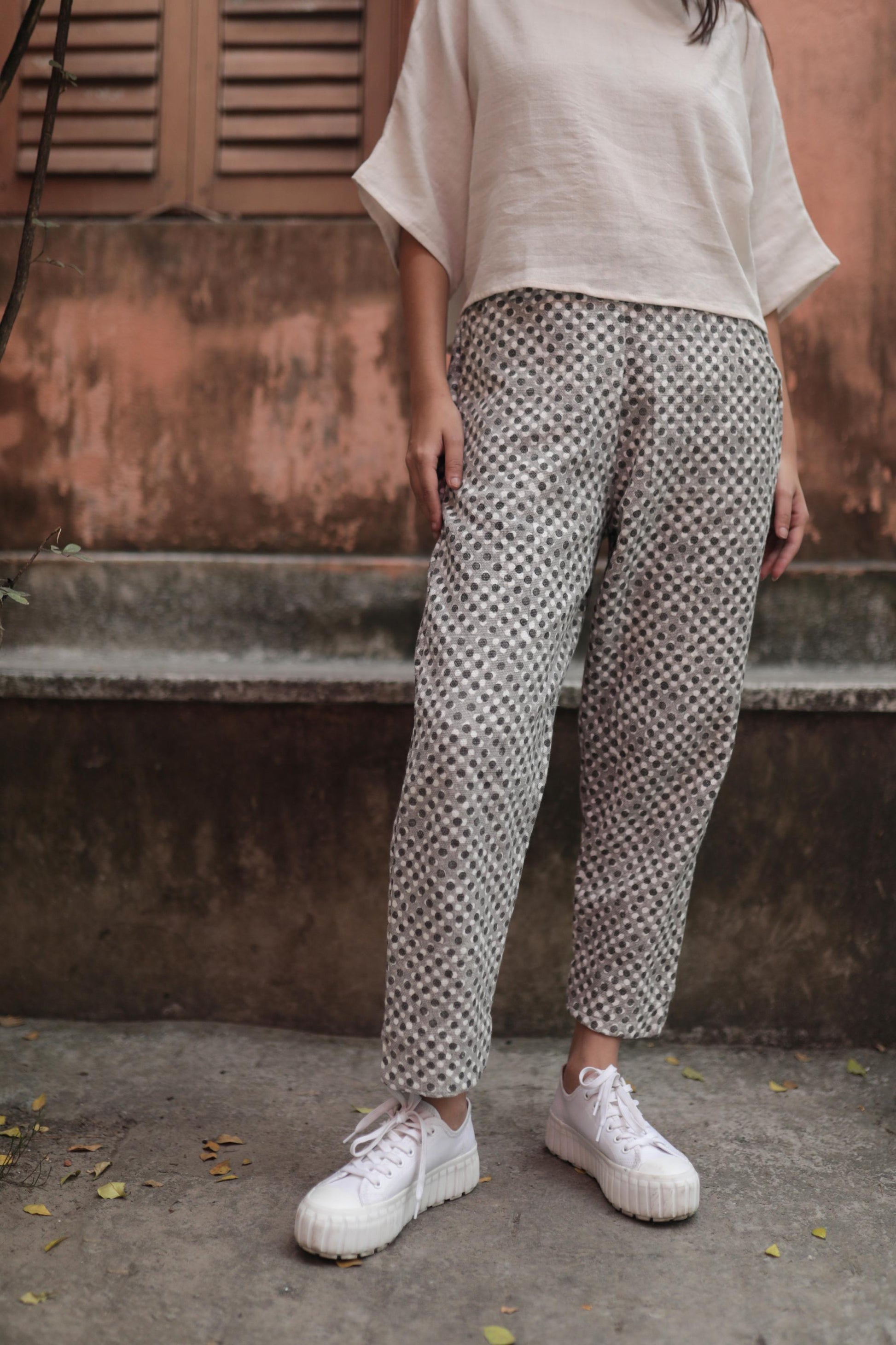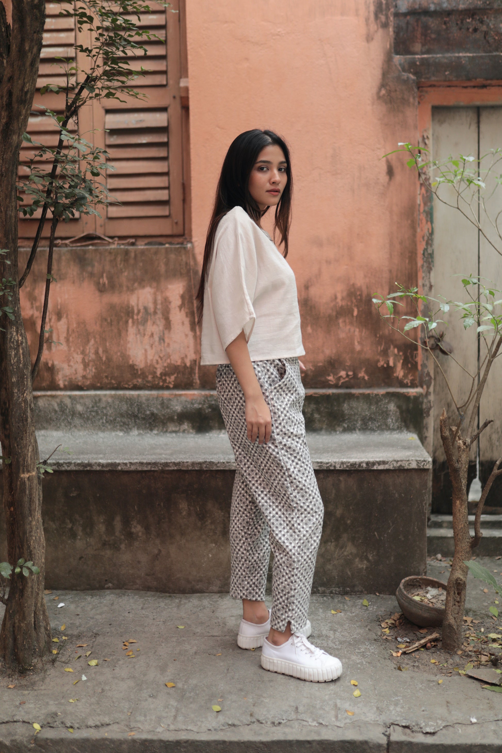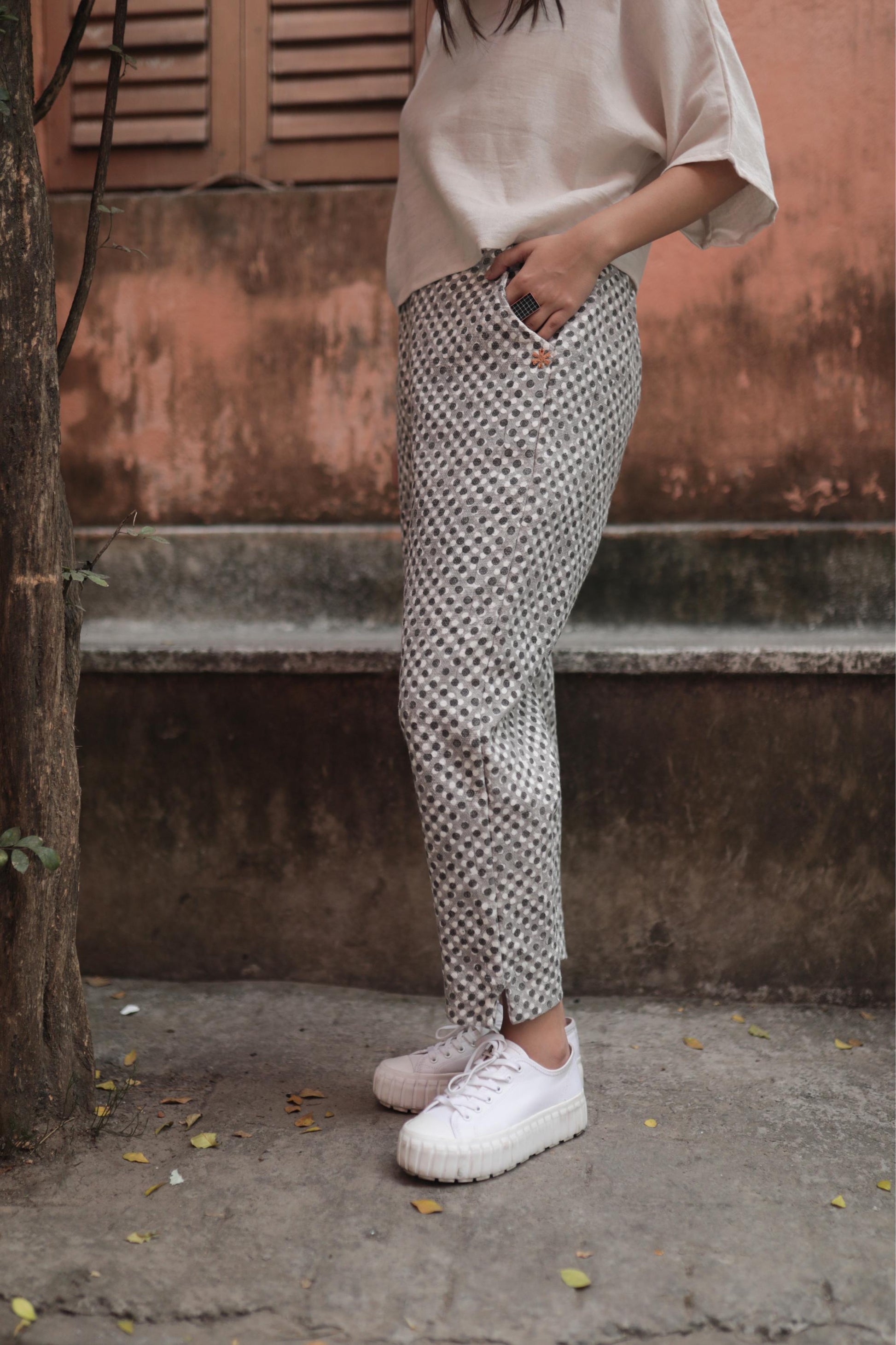 made from block printed zero count khadi cotton fabric, these pants are chic, and oh-so-comfy. these bottoms paired with any of our airy crop tops makes for those summer morning meetings at work.