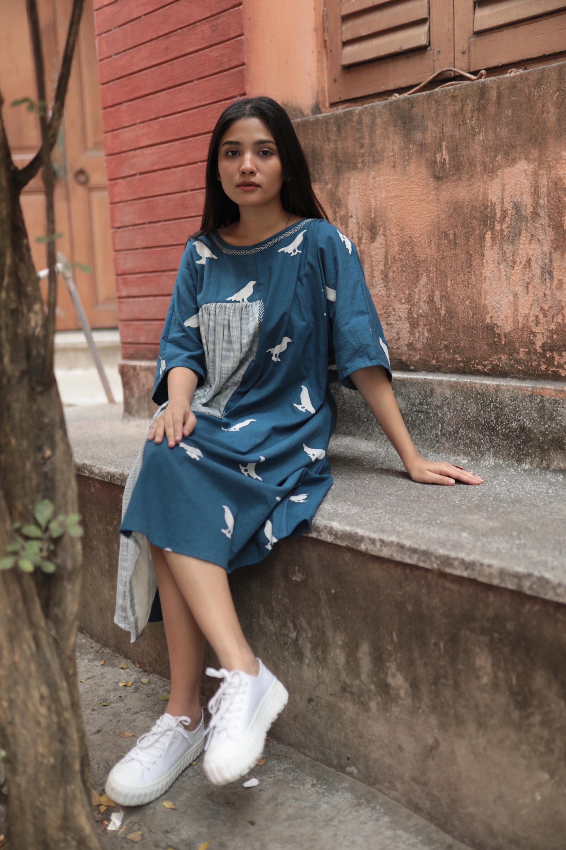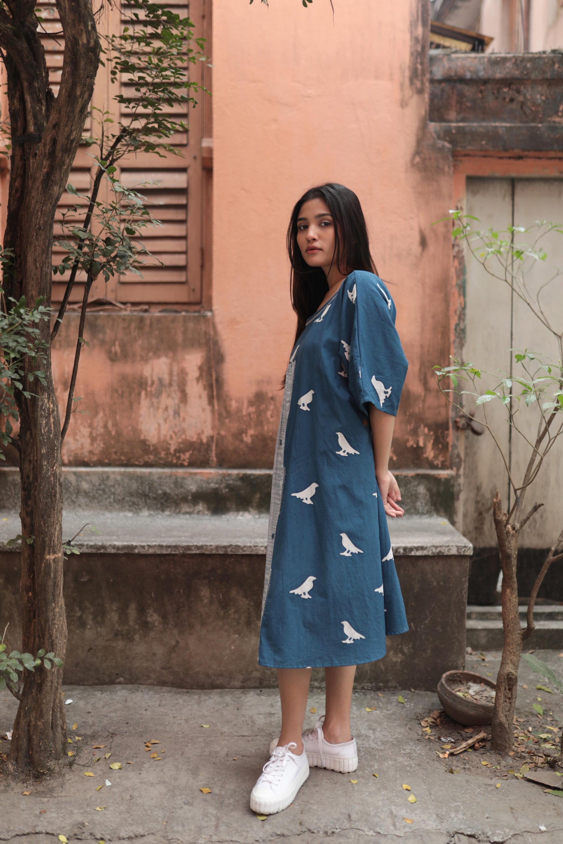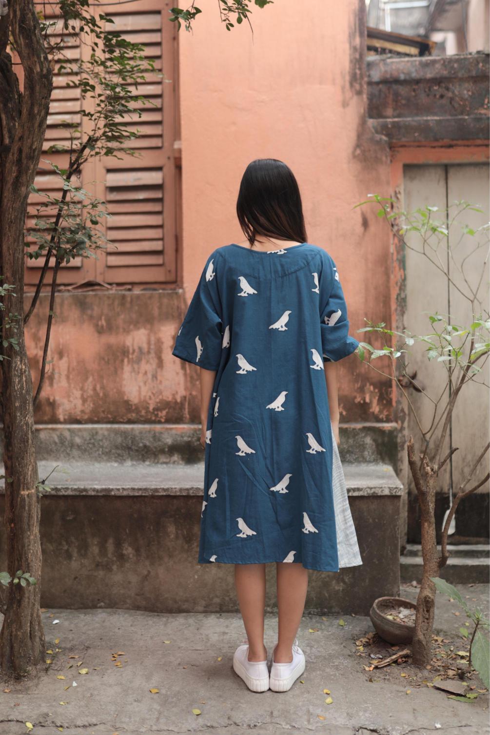 our kaak er jhank dress is made with a hand-batik printed crow / কাক motif on soft khadi cotton. with deep pockets on either side and expansive gathers on one side, this is so airy that you will feel like you are floating through life. it is lightly accented with a fish bone stitch along the neck and pleats, and little blue tawgor flowers on the body.