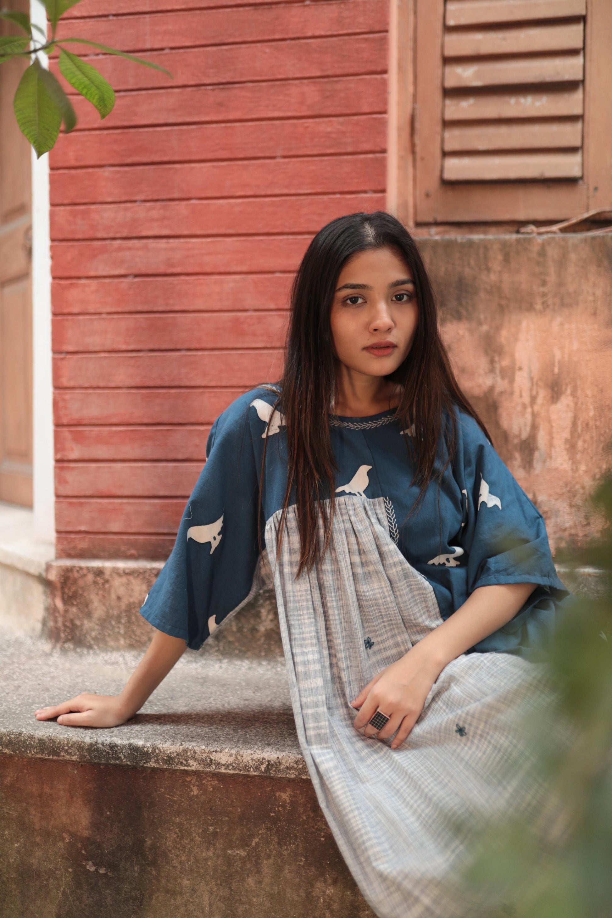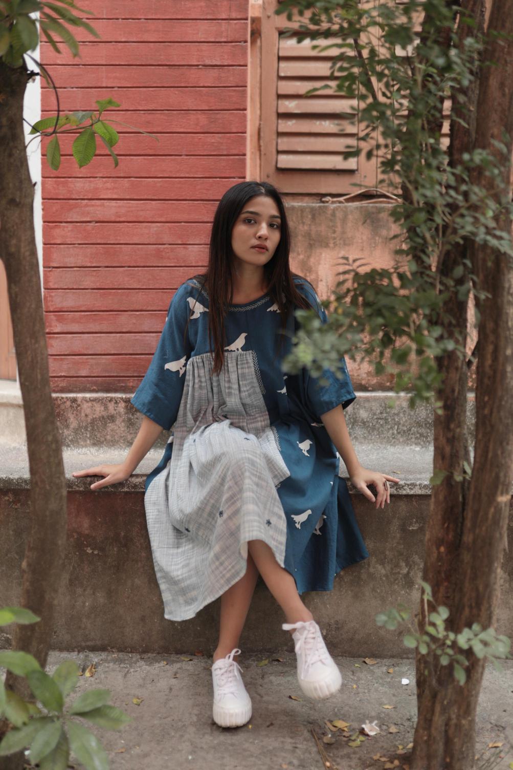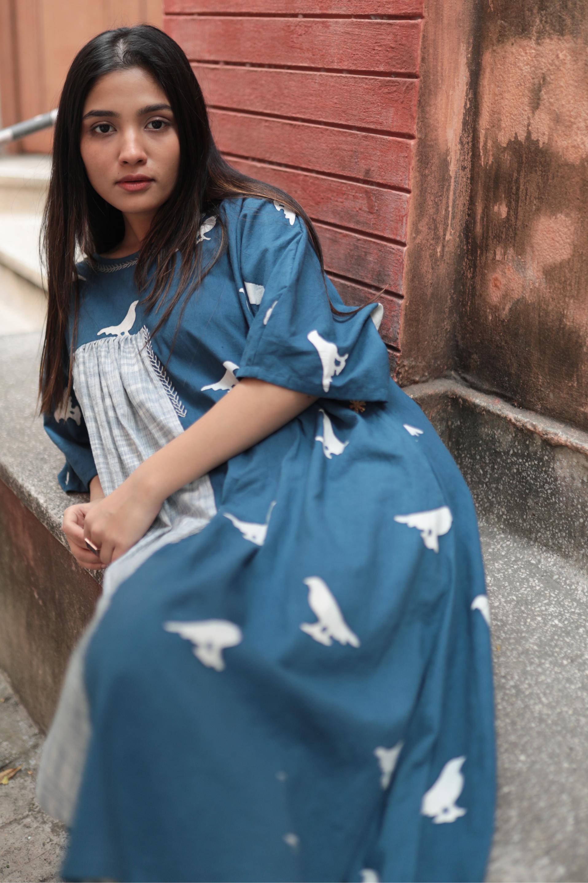 our kaak er jhank dress is made with a hand-batik printed crow / কাক motif on soft khadi cotton. with deep pockets on either side and expansive gathers on one side, this is so airy that you will feel like you are floating through life. it is lightly accented with a fish bone stitch along the neck and pleats, and little blue tawgor flowers on the body.