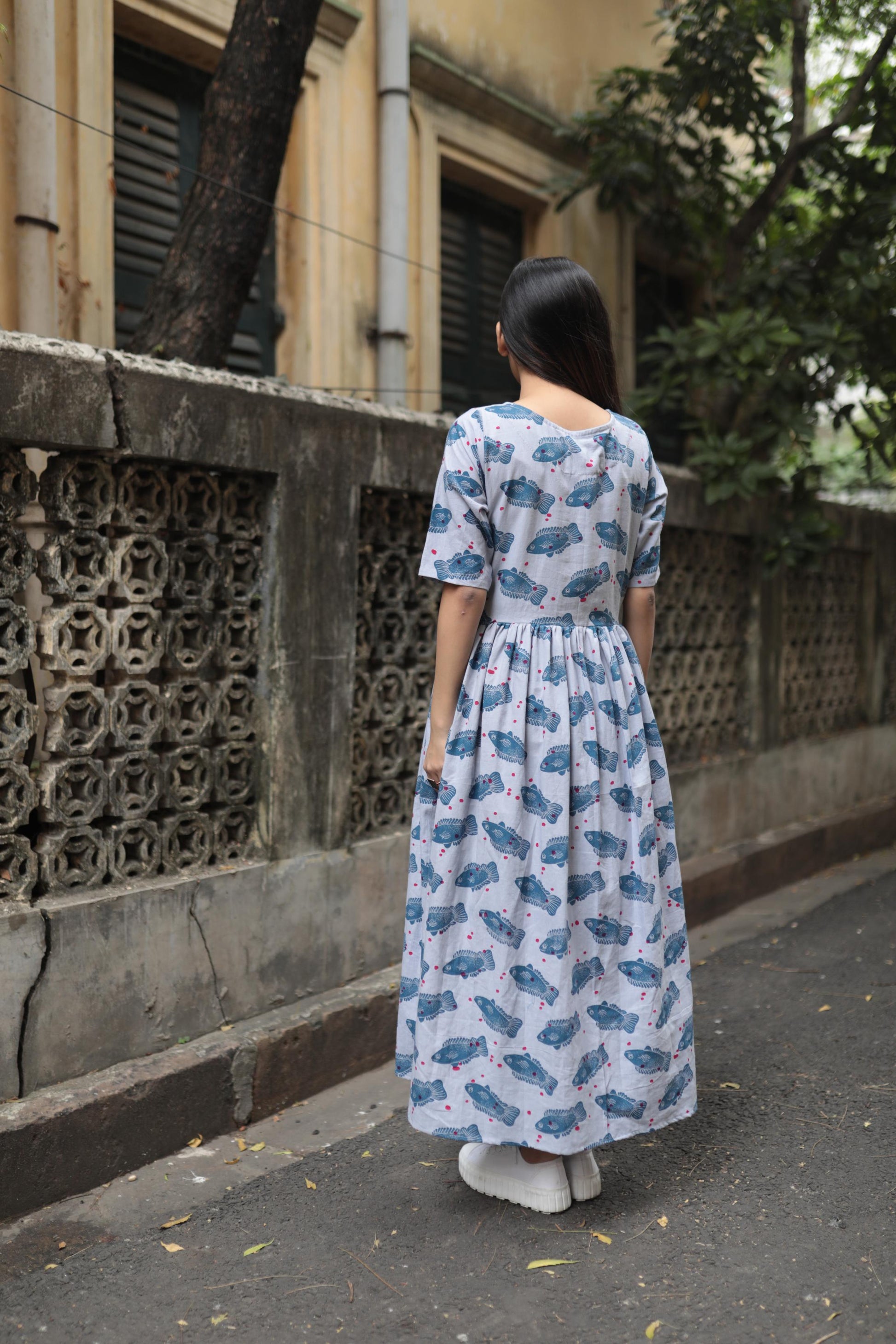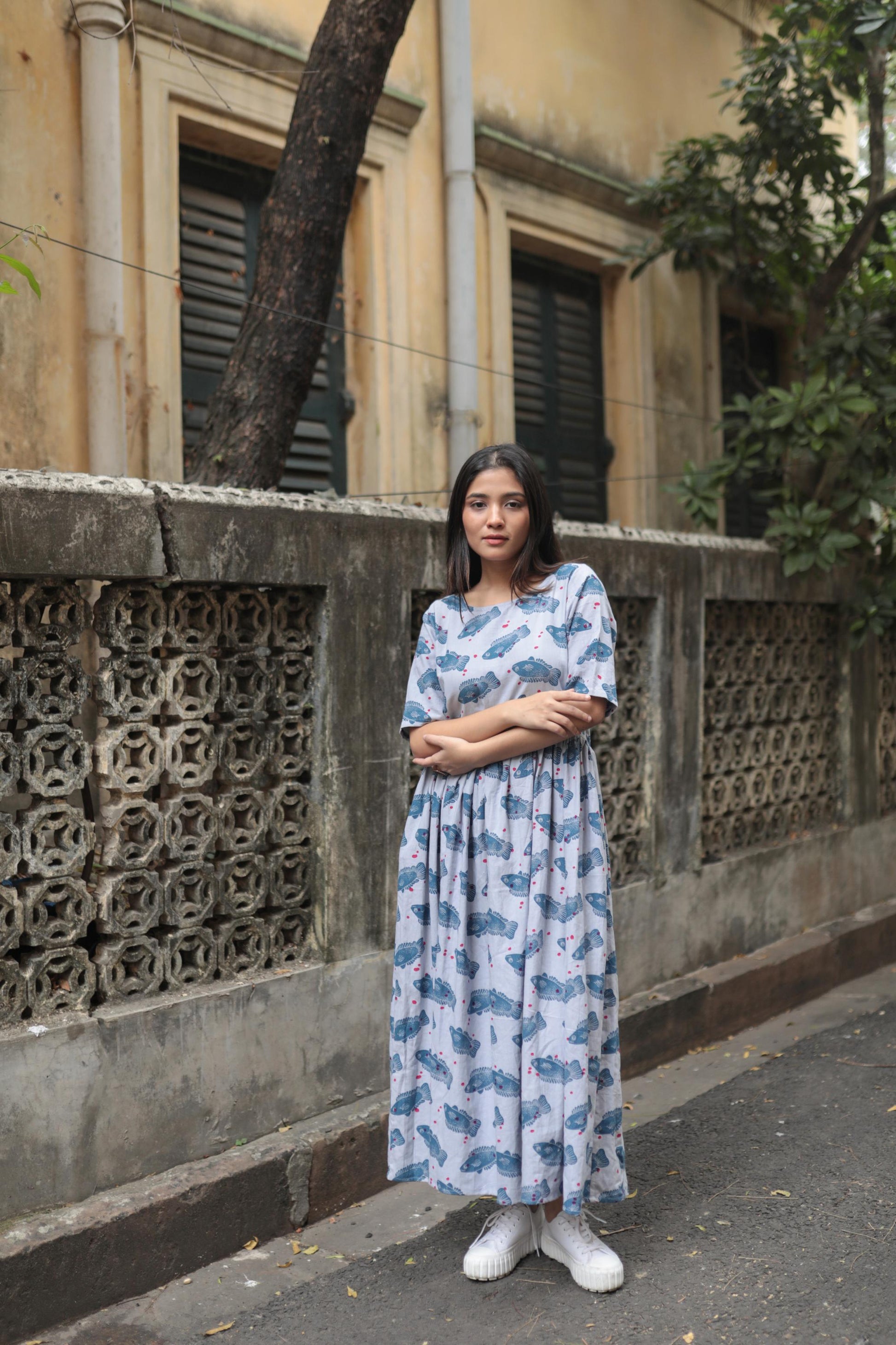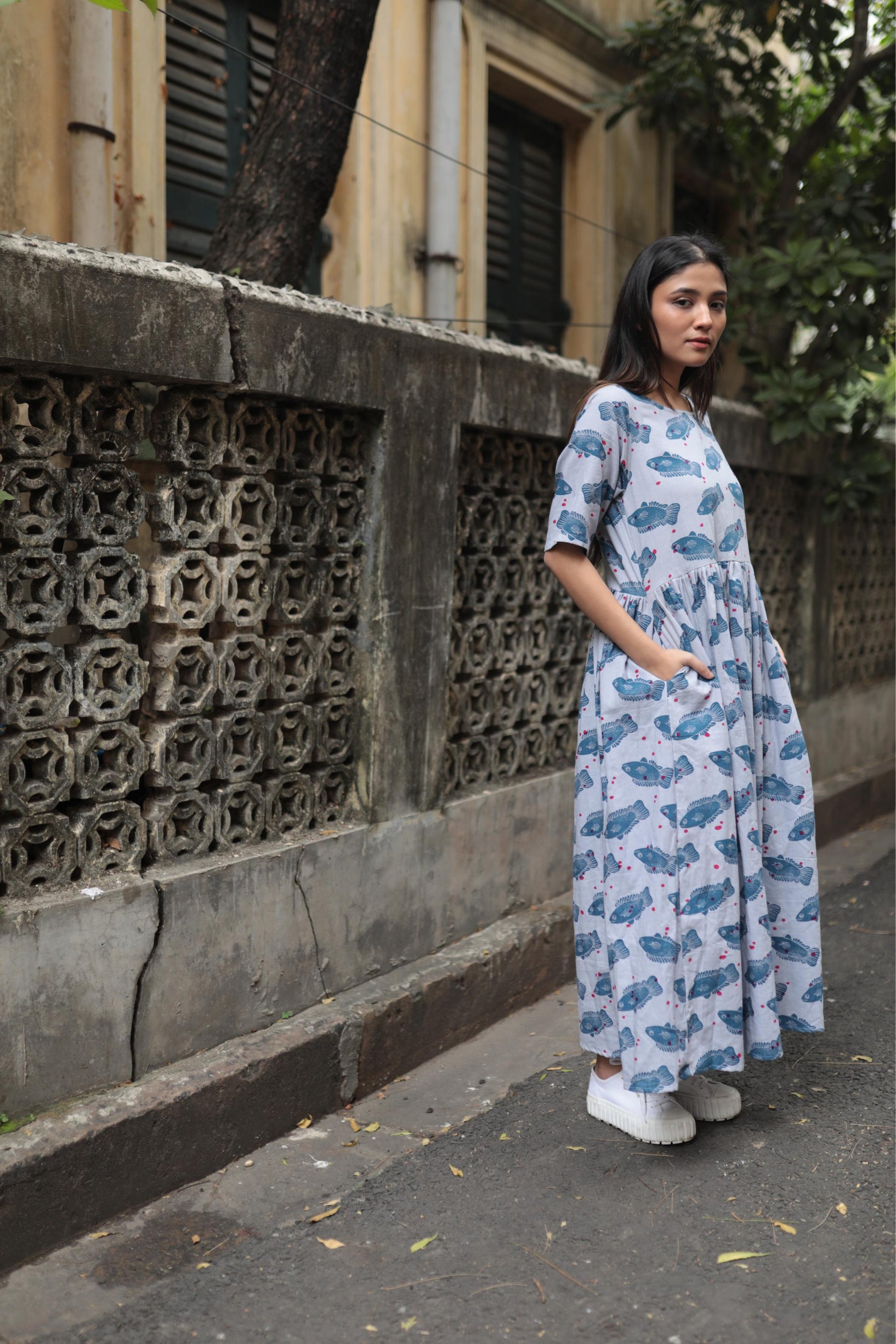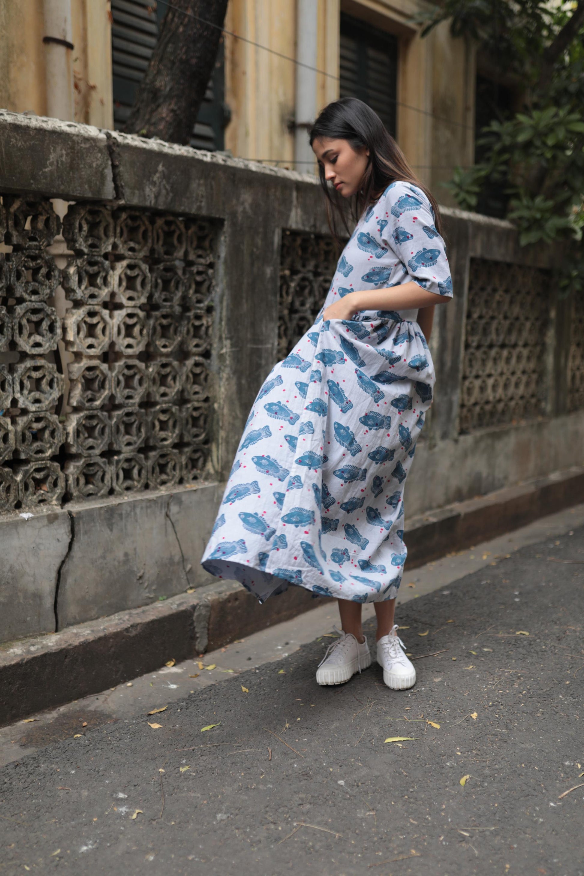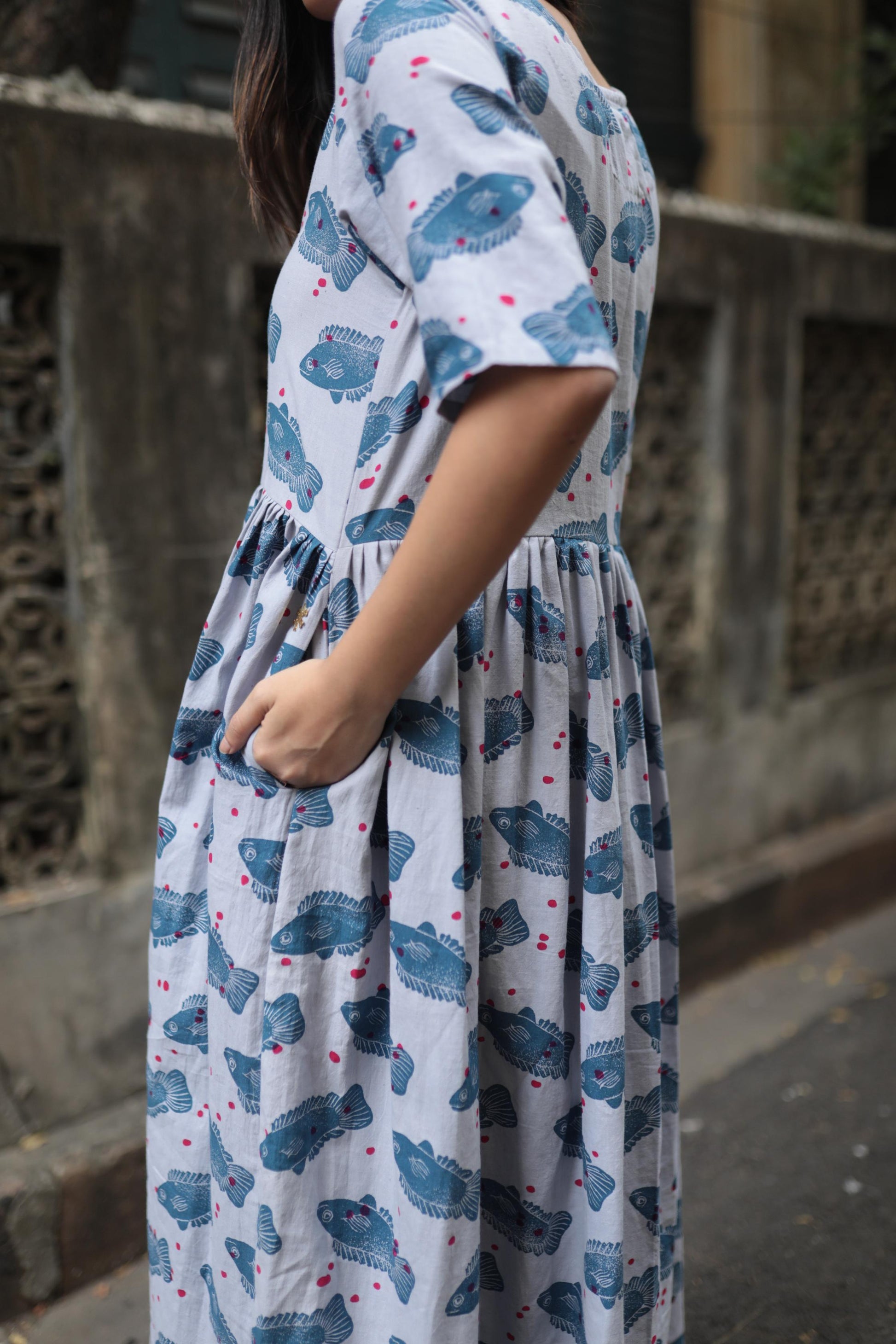 a school of happy koi mach printed on handwoven khadi cotton, this dress has a laid-back fit with relaxed pleats around the waist, creating a frock style fall. whether you're heading out for a brunch date or for a dinner with fam, this dress will help you swim into a happy place.