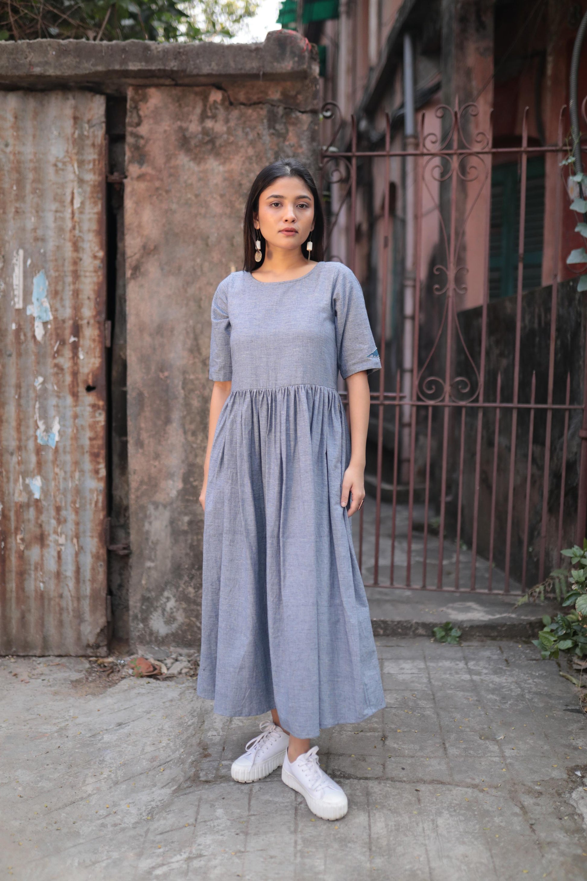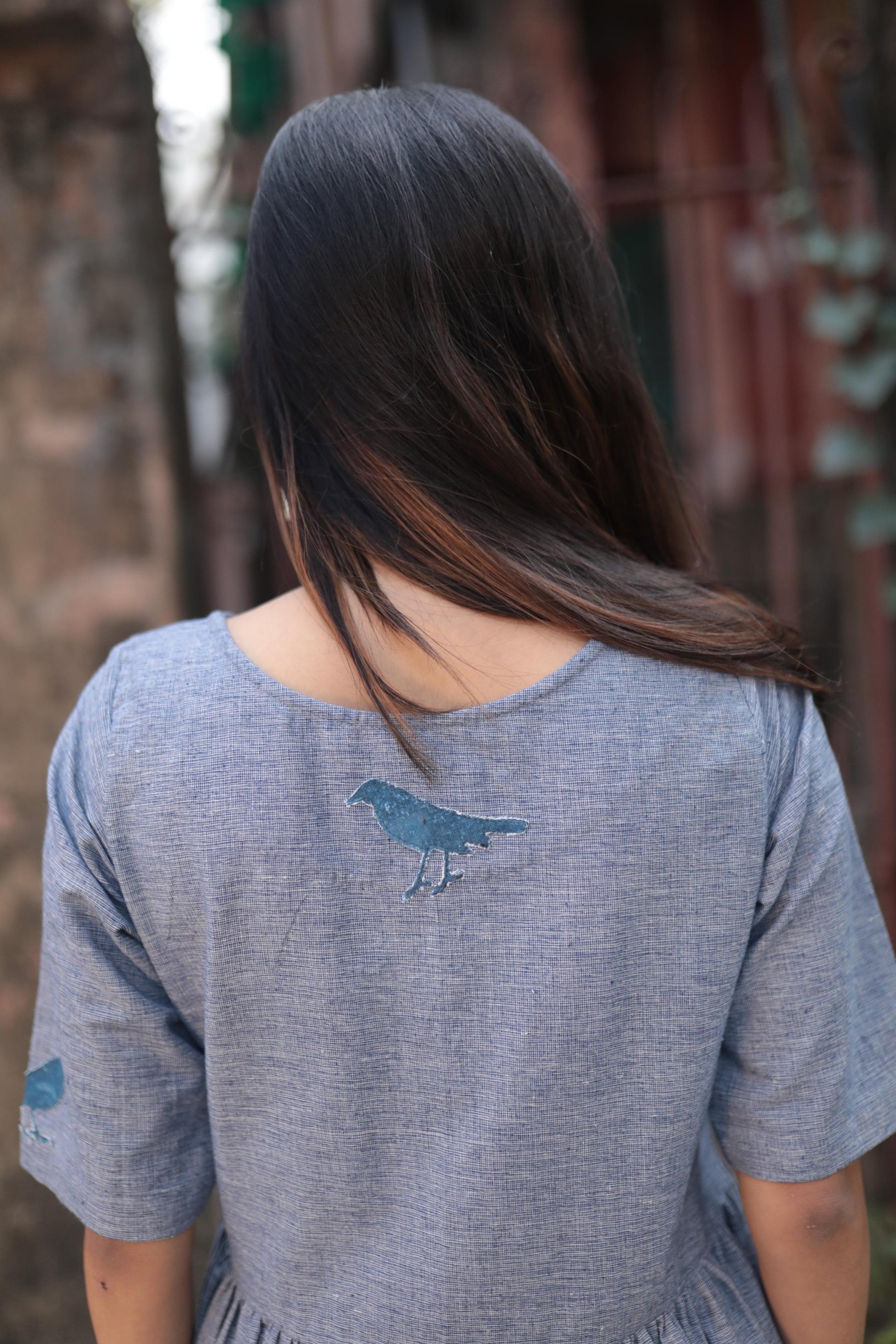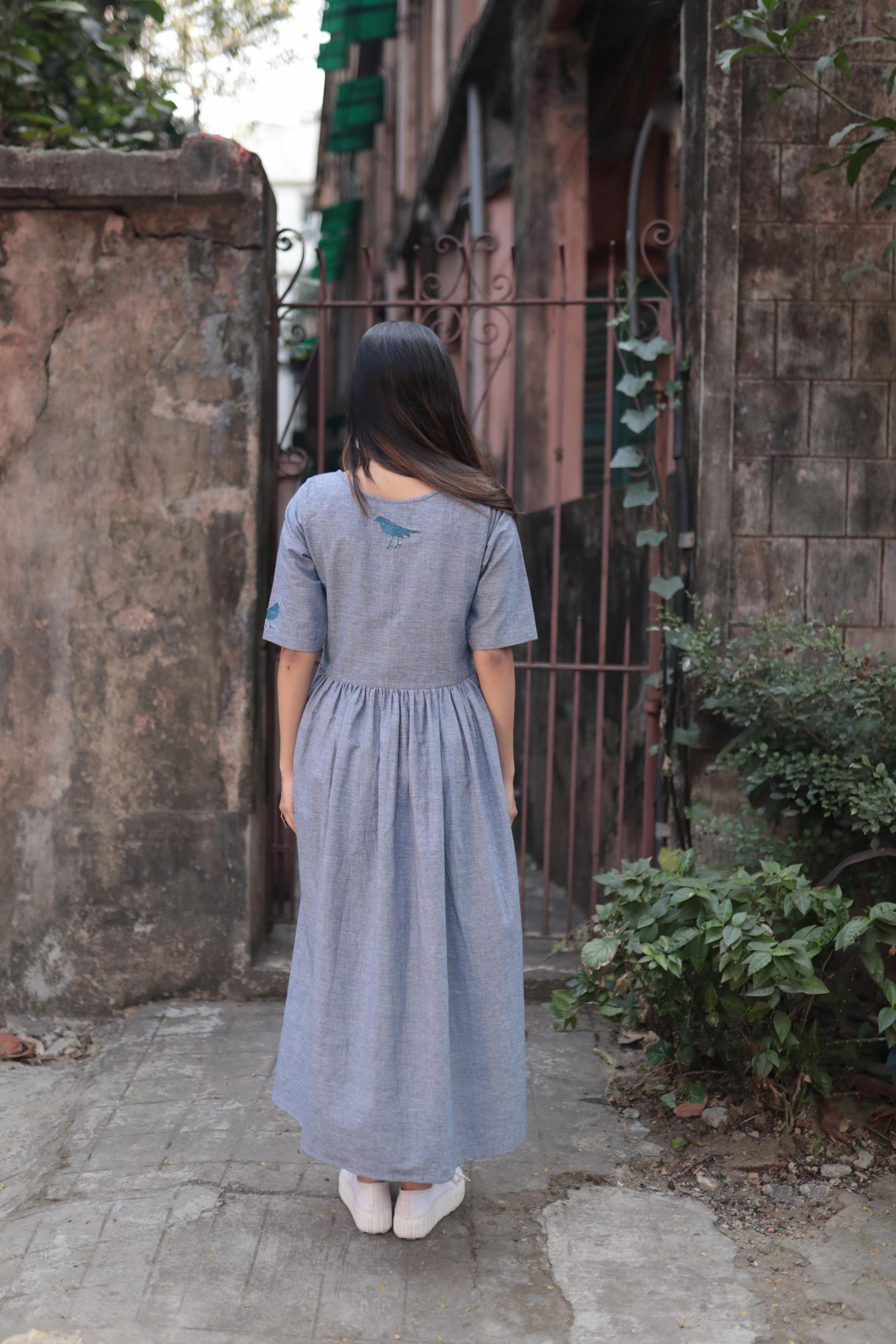 made with a textured khadi cotton handwoven in murshidabad, this dreamy blue dress will help you twirl your way through the summer. our hand-stitched whimsical crow / কাক friend has your back and of course it has deep pockets for your trinkets.